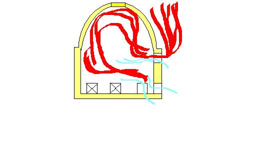 Если вычислять объём топки по учебникам, то для сжигания в час 500кг дров нам понадобится всего лишь 5м3 не занятого топливом свободного объёма топки или камеры сгорания. Пустяк. Но, не тут то было. Здесь, у нас, даже шести кубов ТОПКИ ( а не топливника) было не достаточно. Просто шесть кубов хватило лишь для 200кг дров с развитой поверхностью в час ( при подовом горении и равномерной подаче). При всём этом деле (200кг/час) наблюдался рост Т в шести кубовой топке, что для нас было не комильфо, так как интенсивность возгонки всех этих самых летучих возрастала. В первом пробном варианте в куполе был выход газов, прямоточный. И если подача была больше этих 200кг/час, то факел переносился за пределы топки и догорание уже шло в атмосферу.